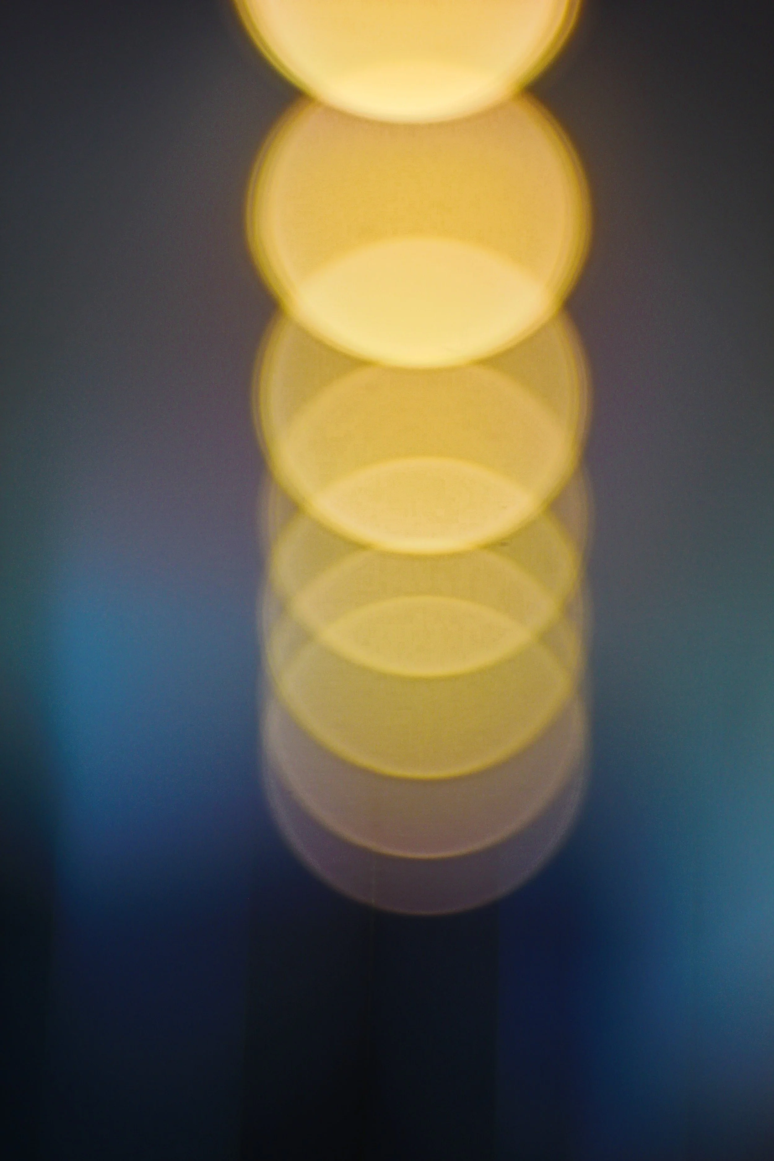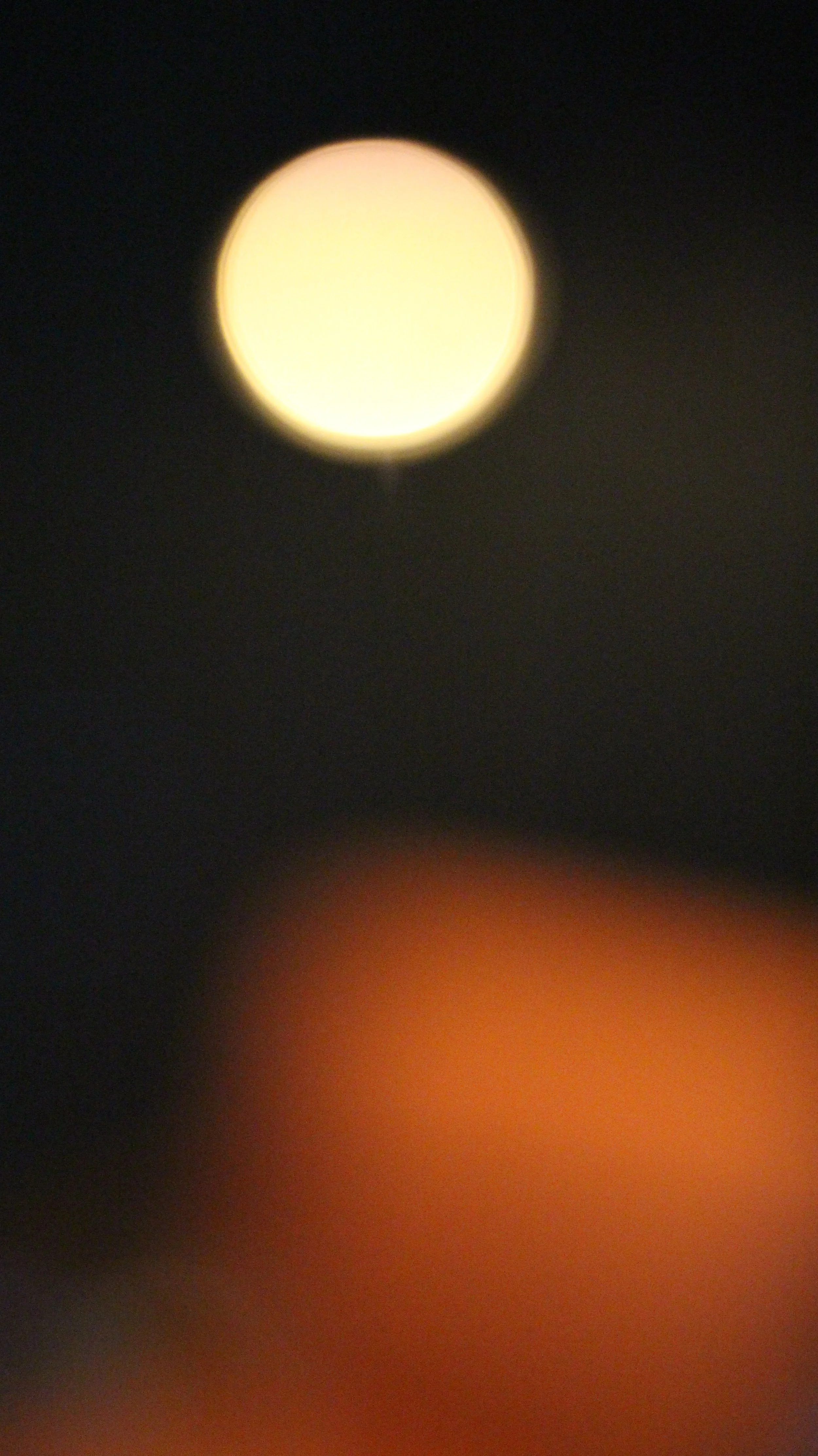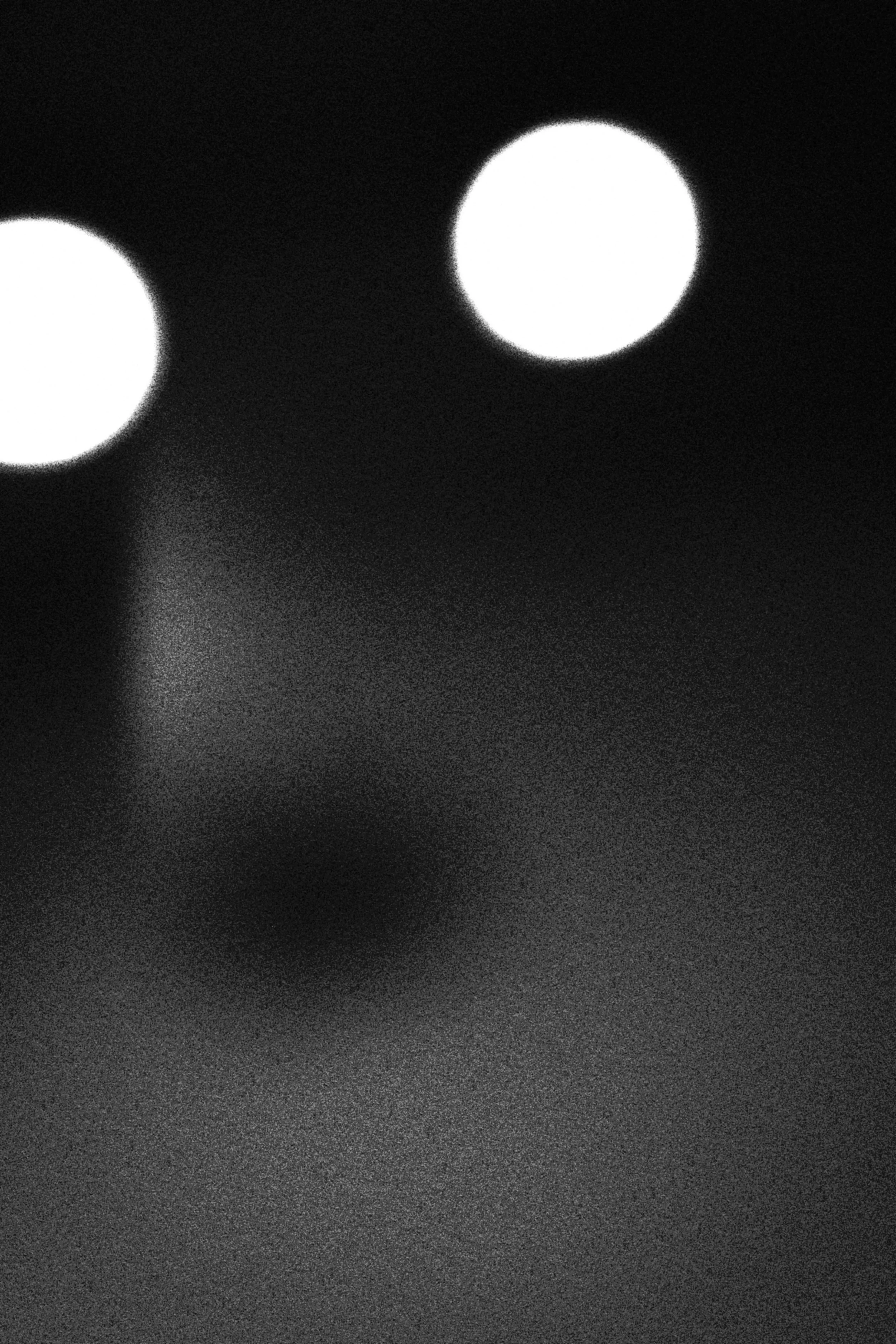 Blurry black and white cityscape at night with bright moon and scattered lights.
