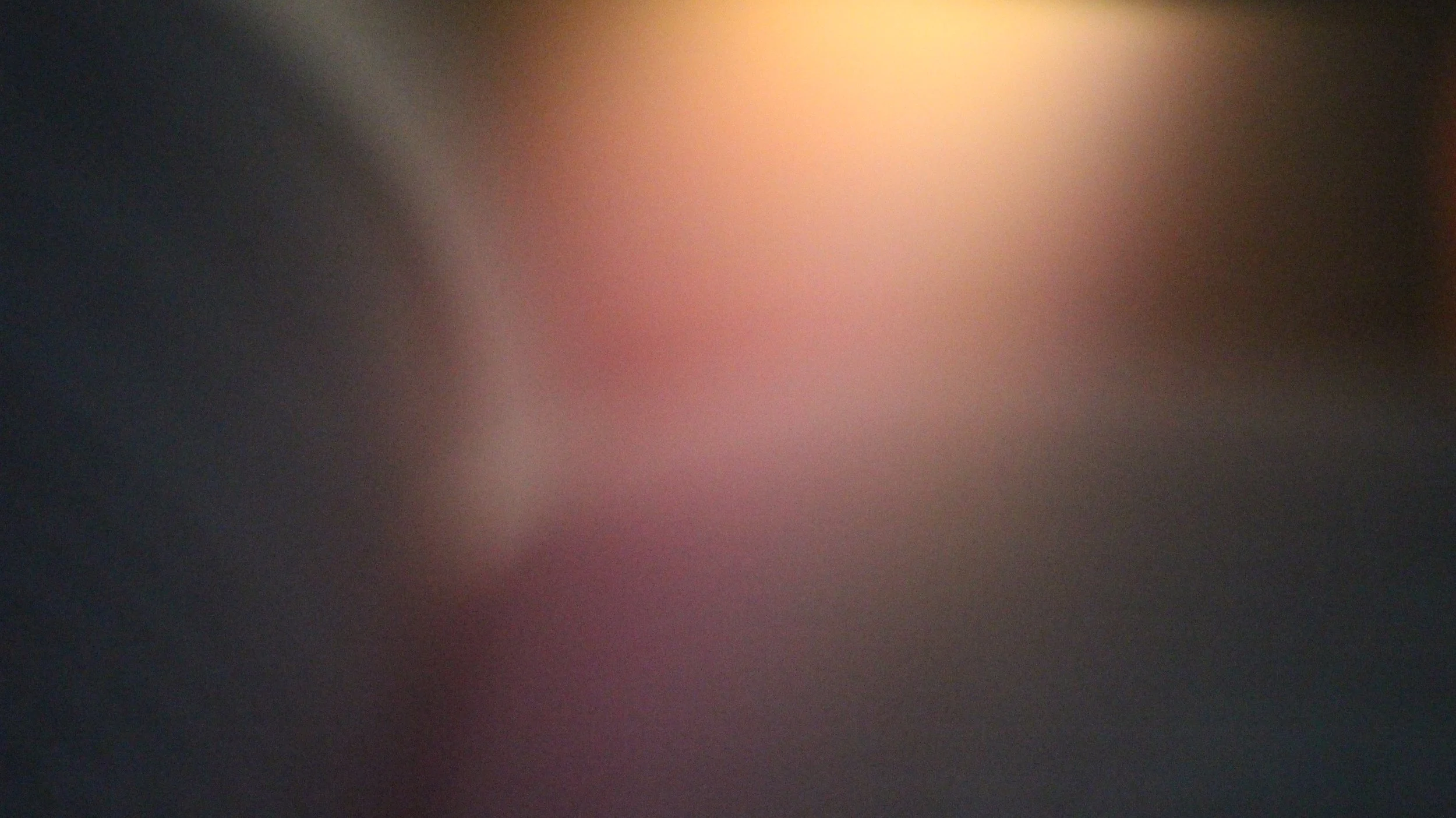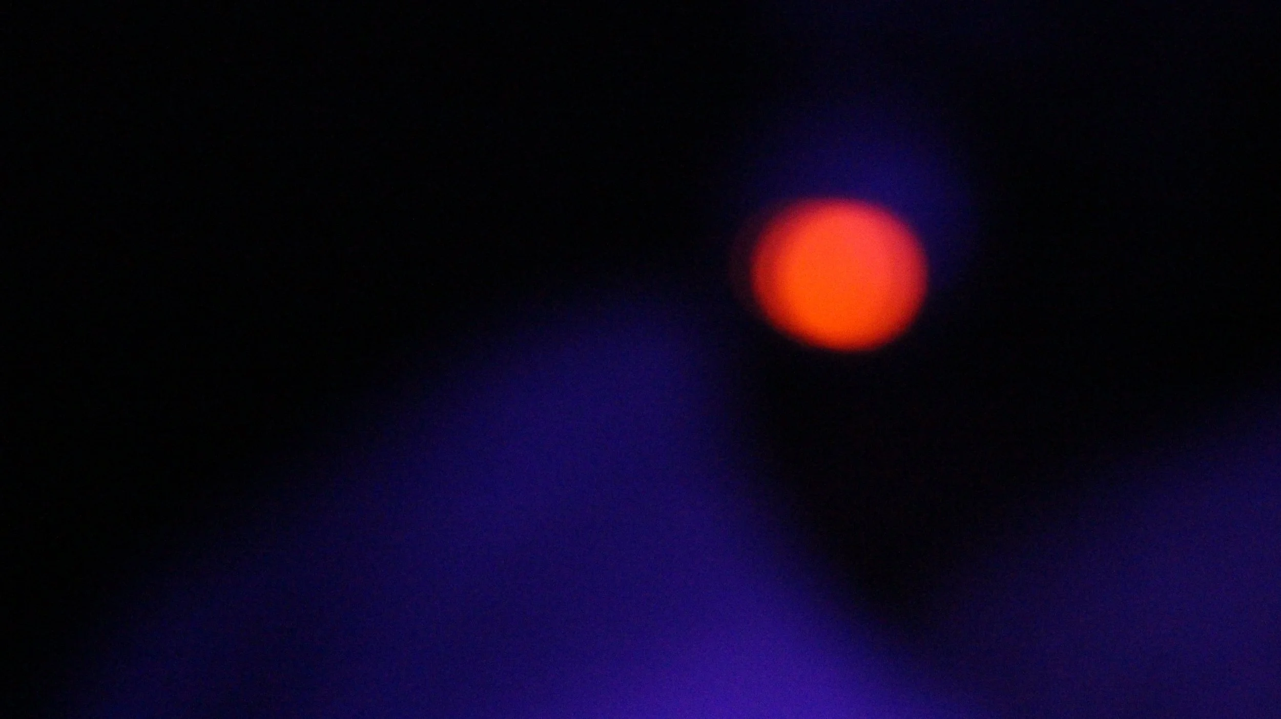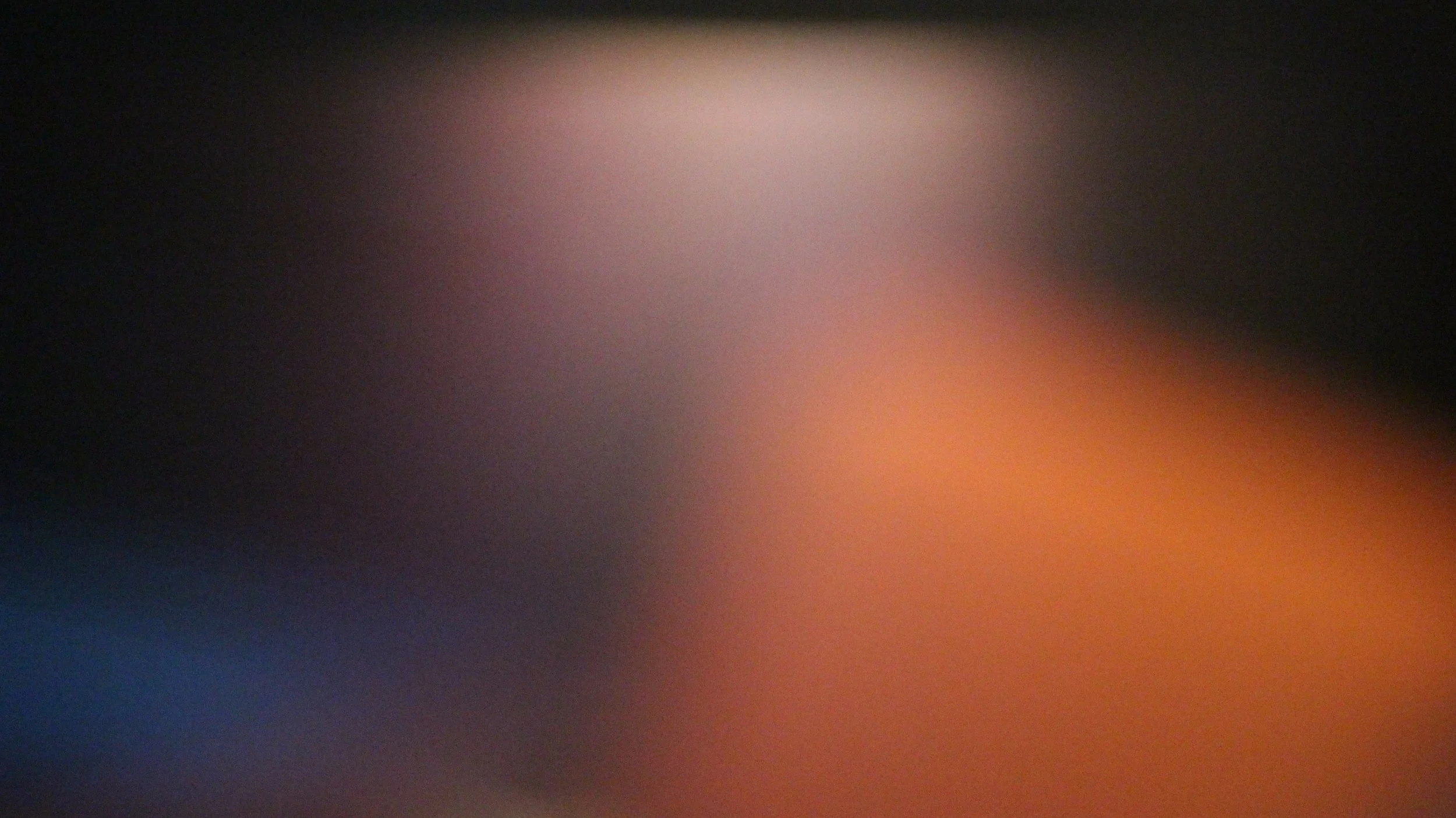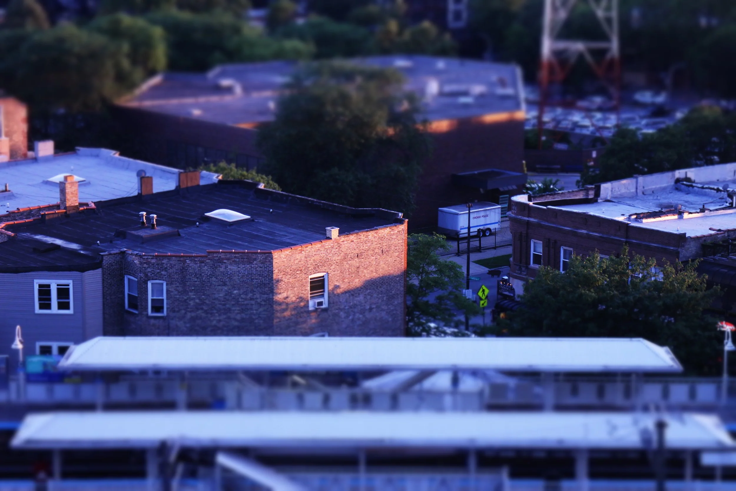 Blurry aerial view through purple and orange tinted window, showing parking lot and buildings.