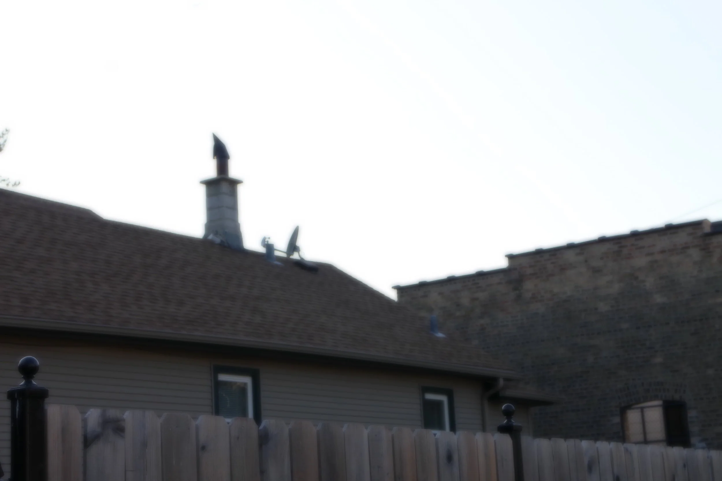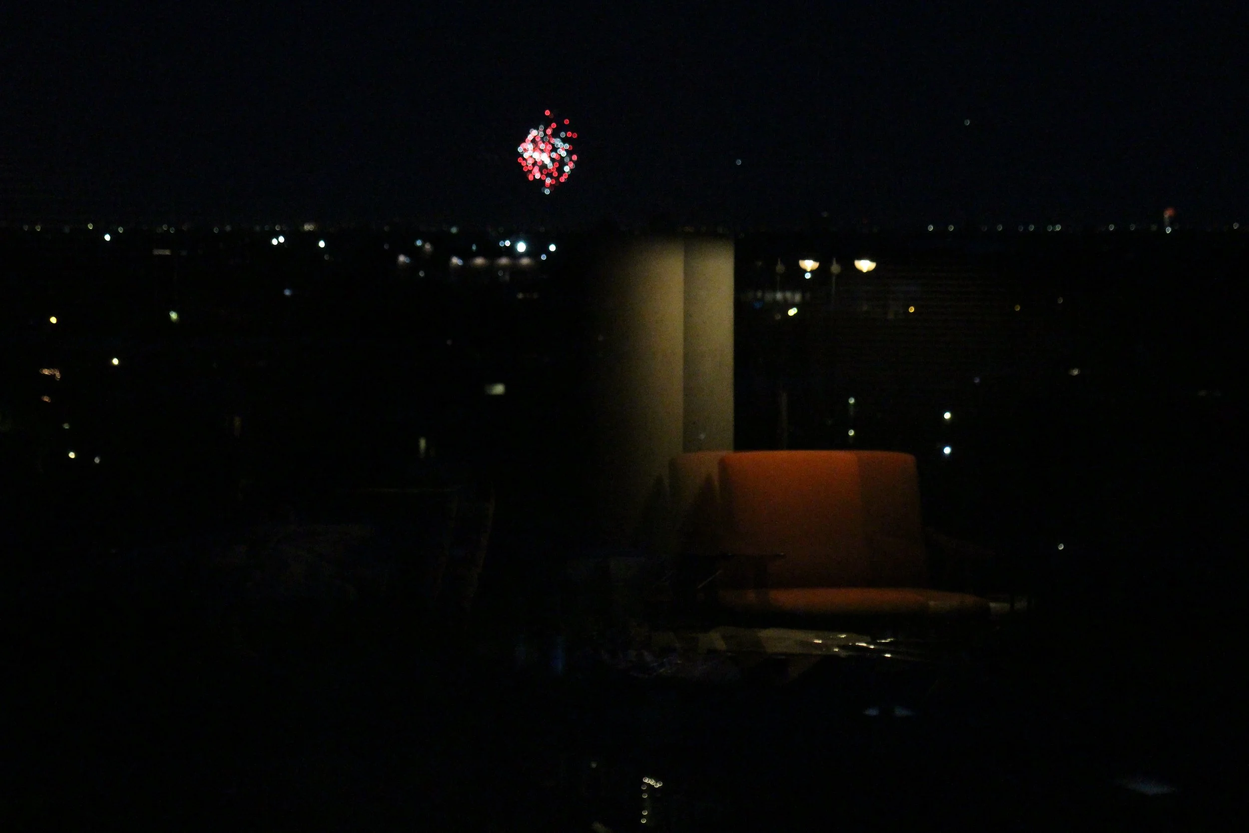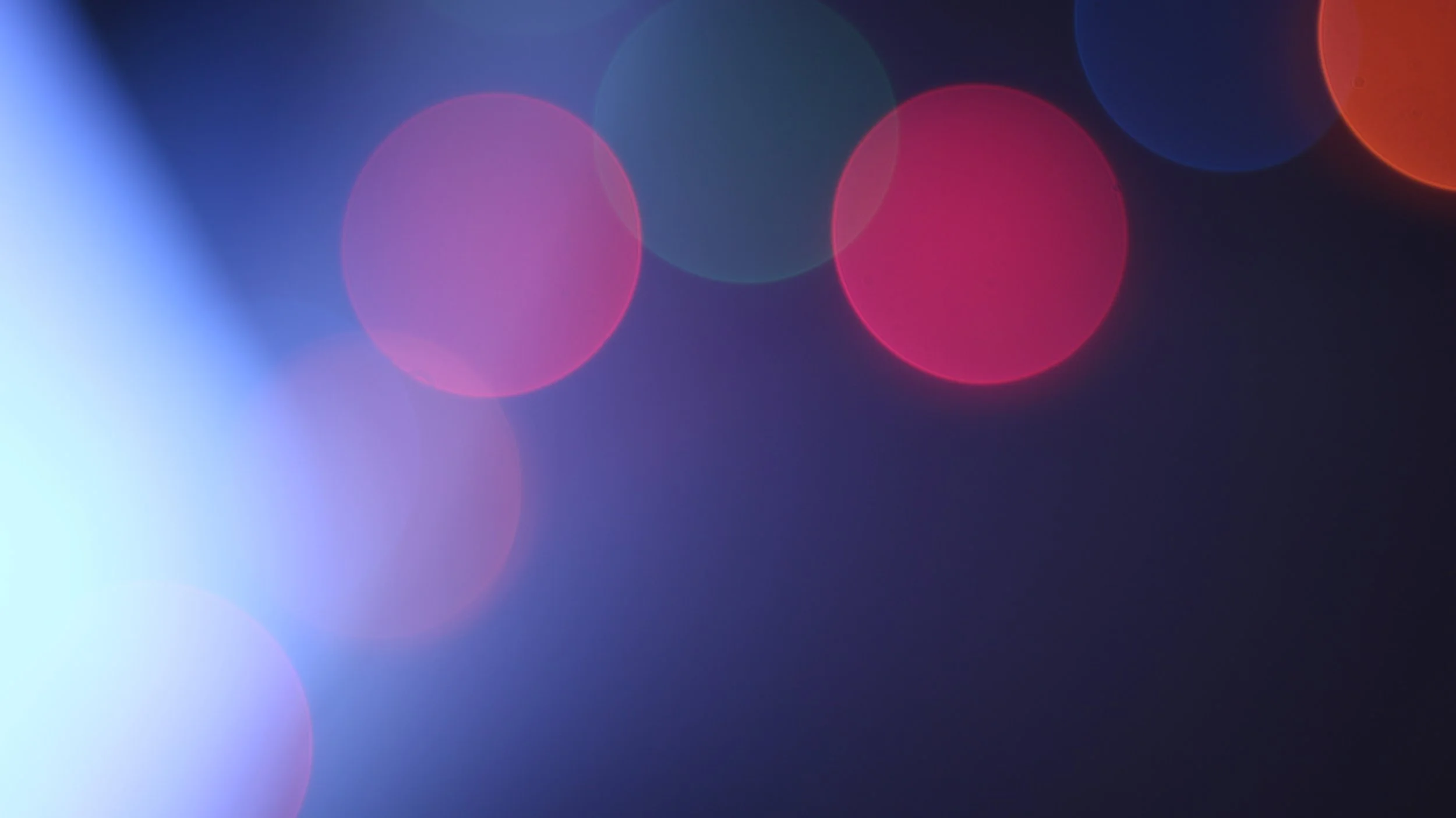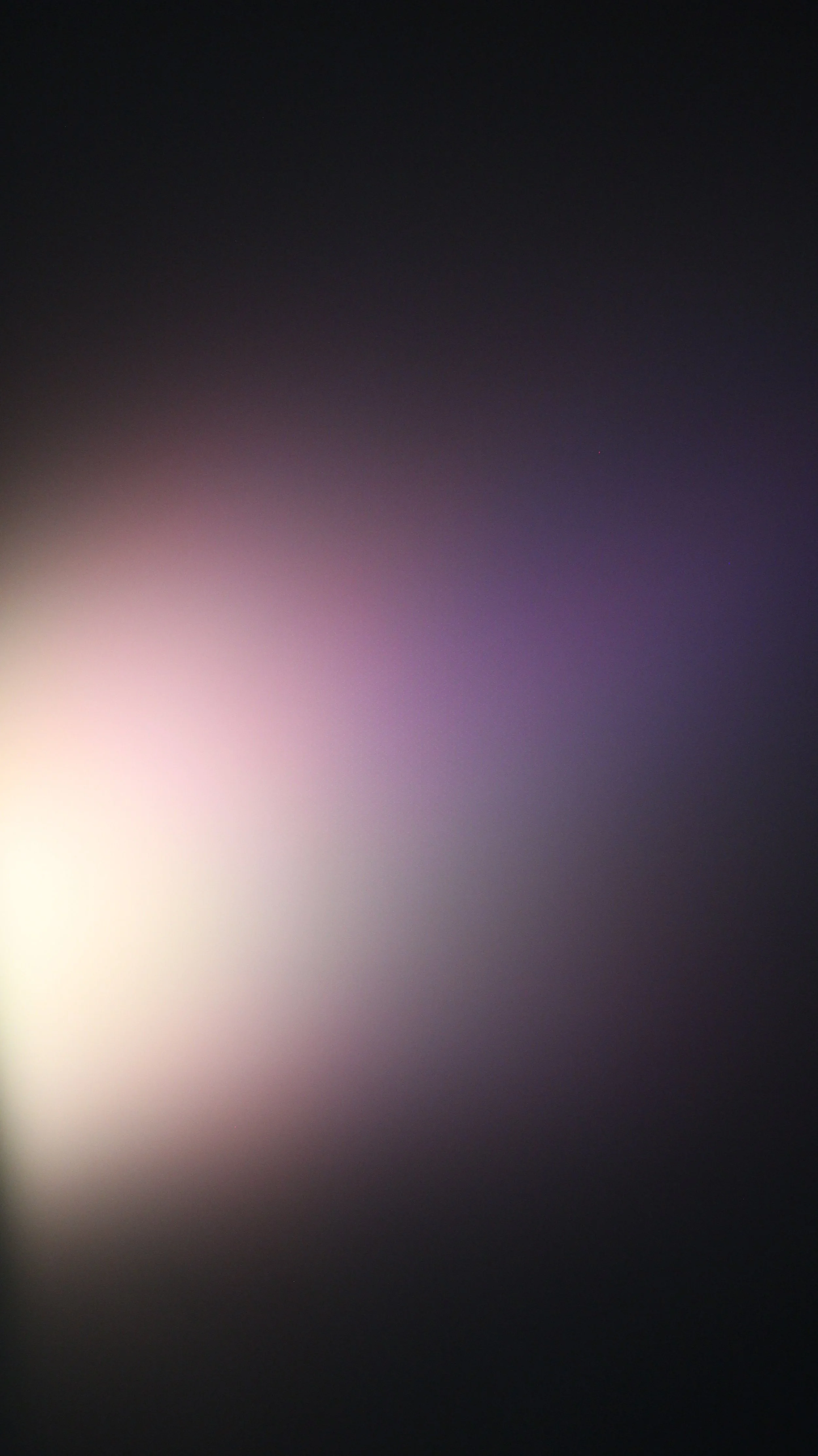 Blurry aerial view through purple and orange tinted window, showing parking lot and buildings.