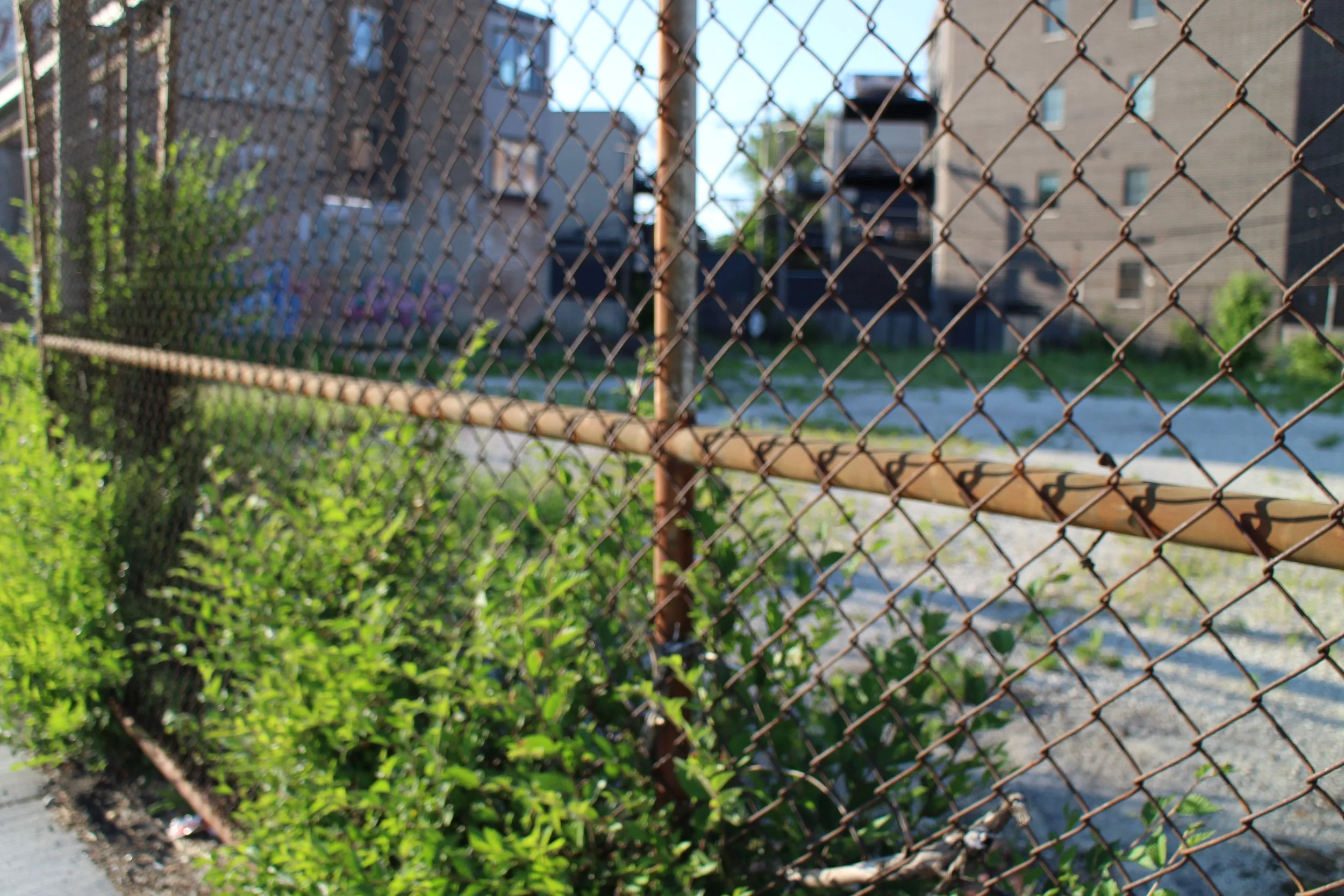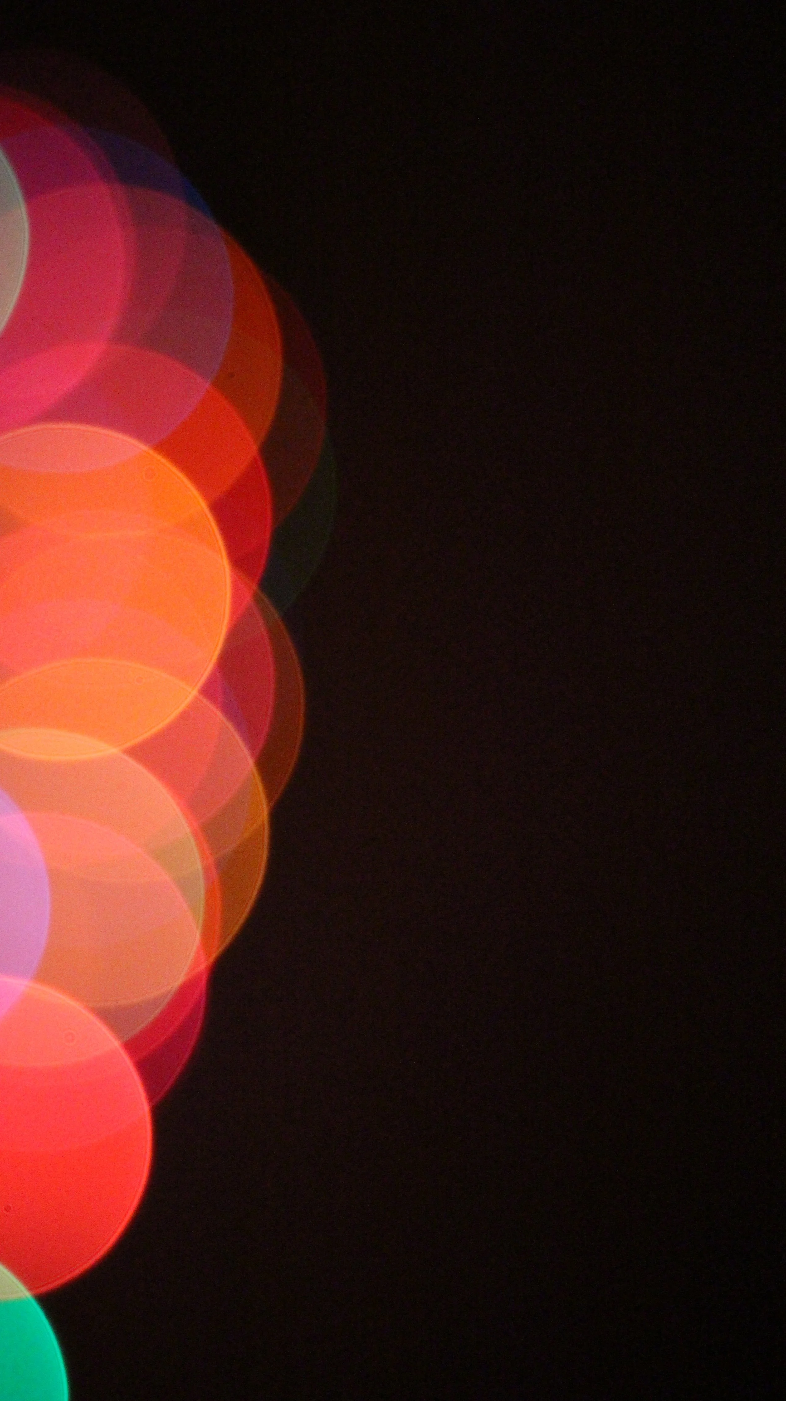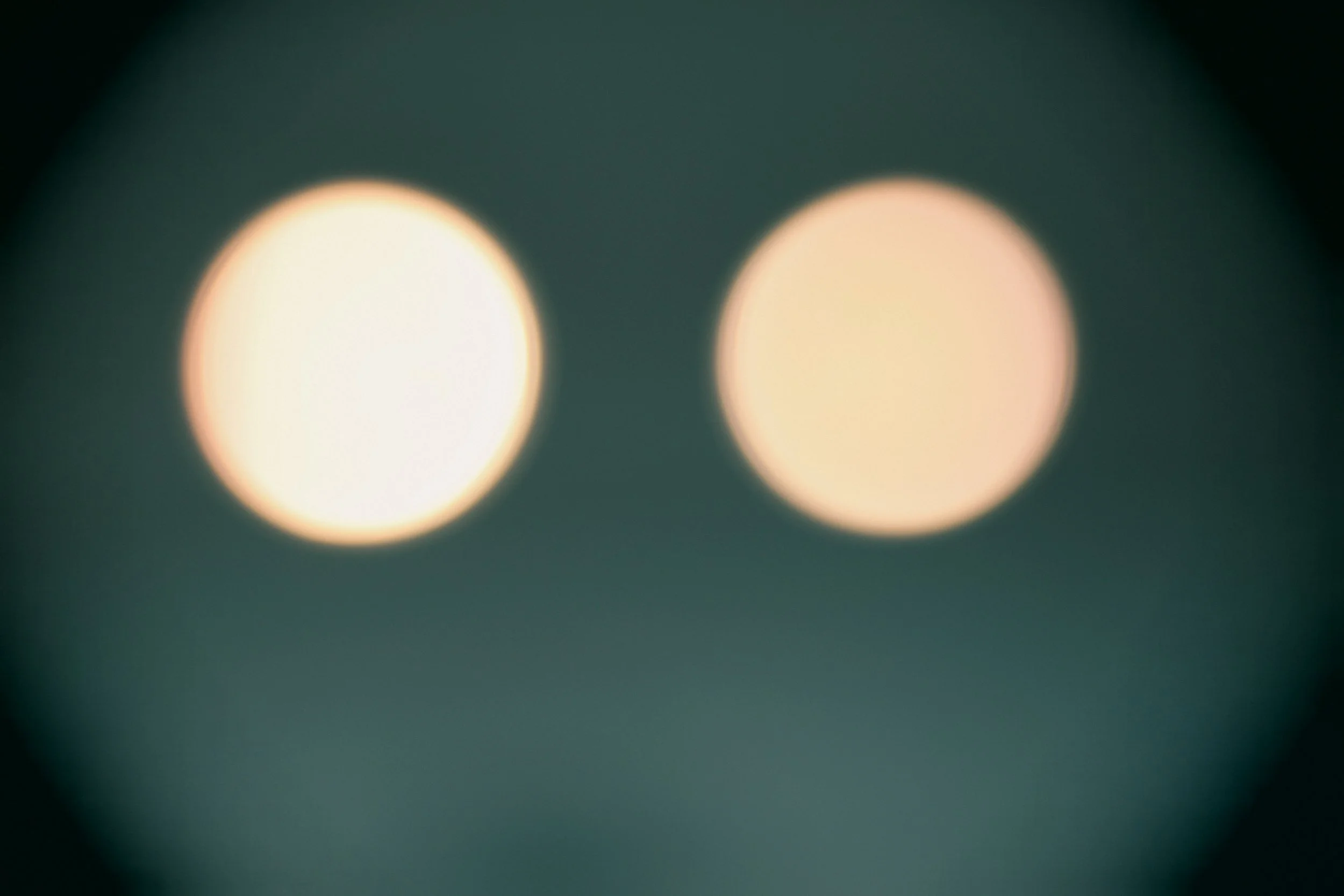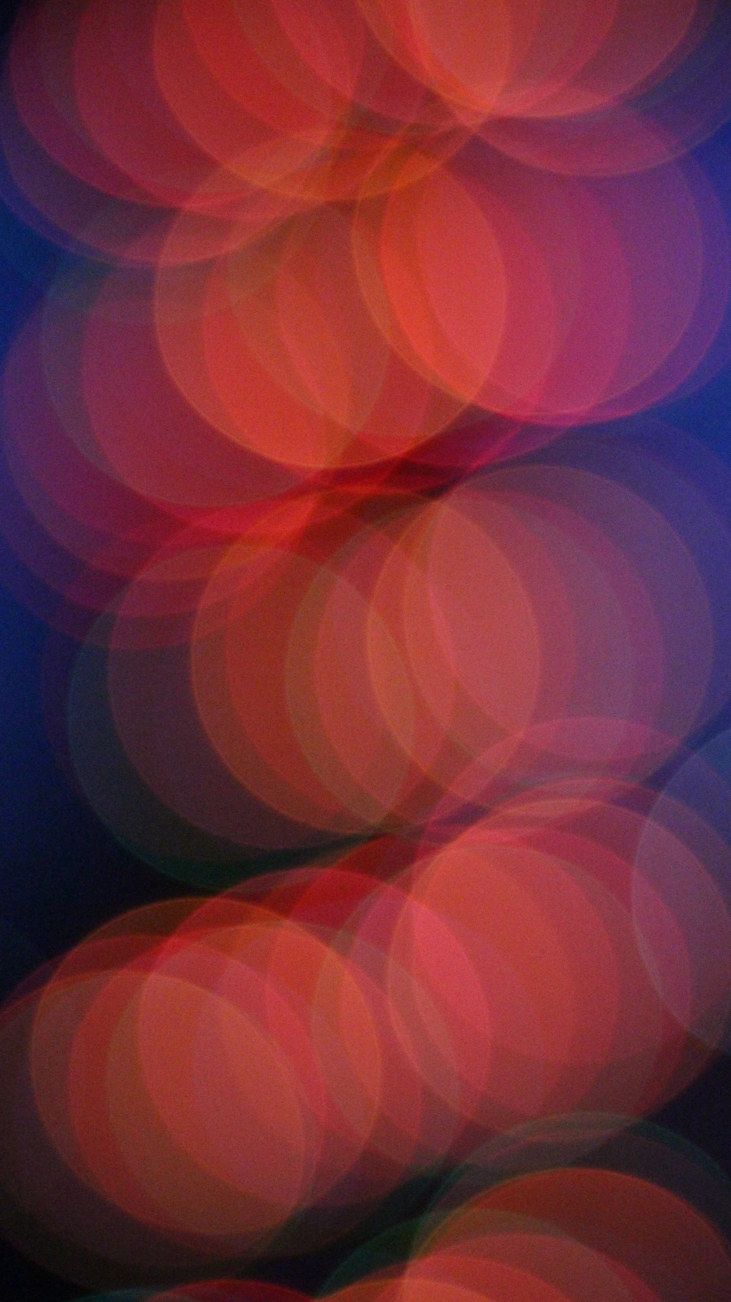 Blurry aerial view through purple and orange tinted window, showing parking lot and buildings.