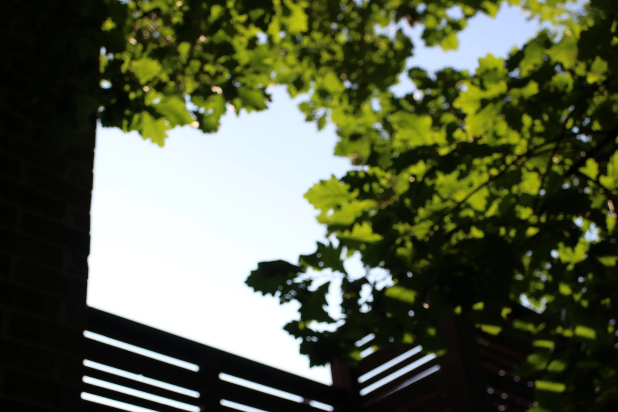 Tree-lined street with parked cars, sun shining through leaves, creating lens flare and shadows on the sidewalk.