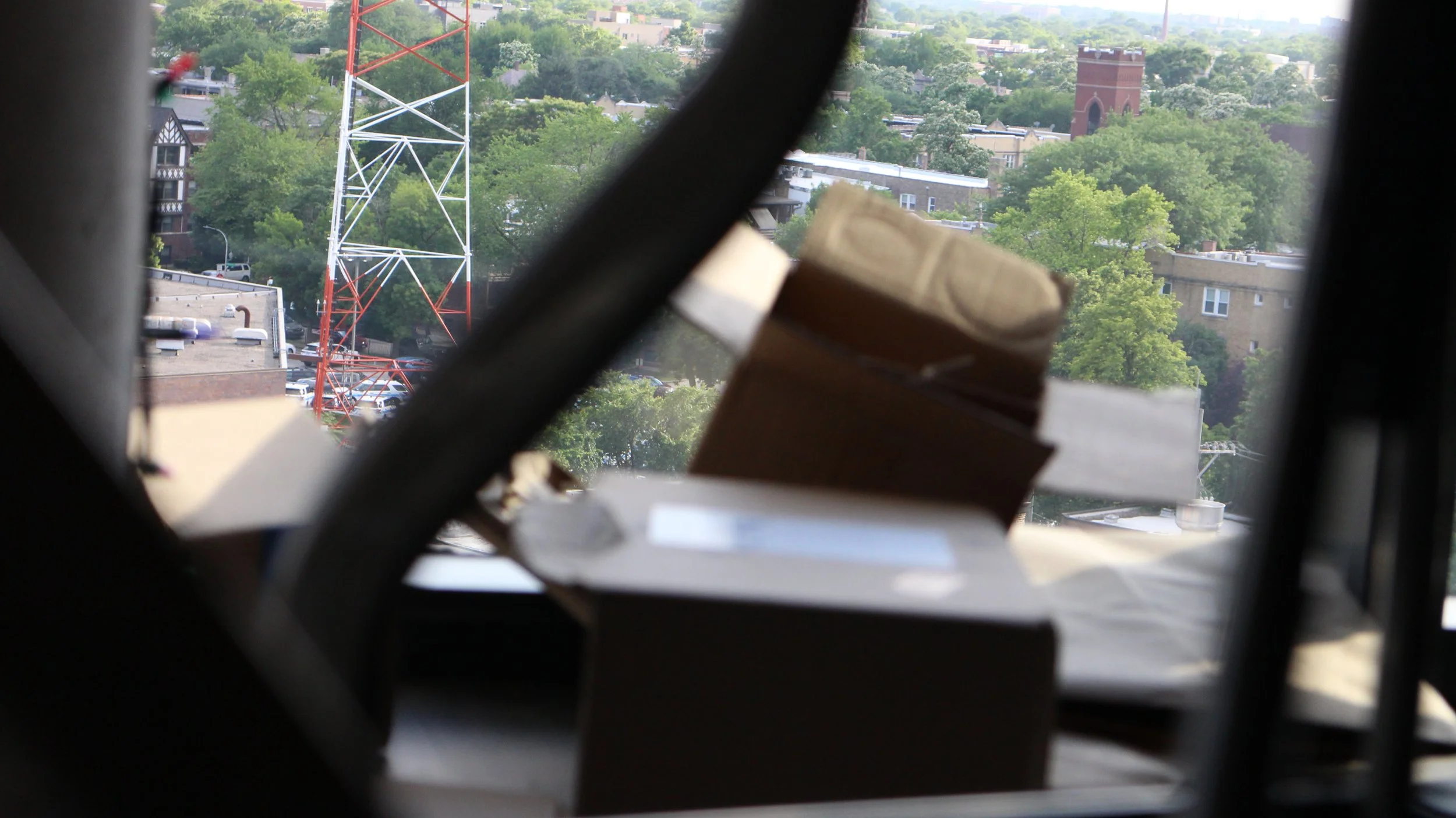 Aerial view of a cityscape with a red heart-shaped balloon in the sky, snowy rooftops, and red brick buildings, with a skyline of high-rise buildings in the background.