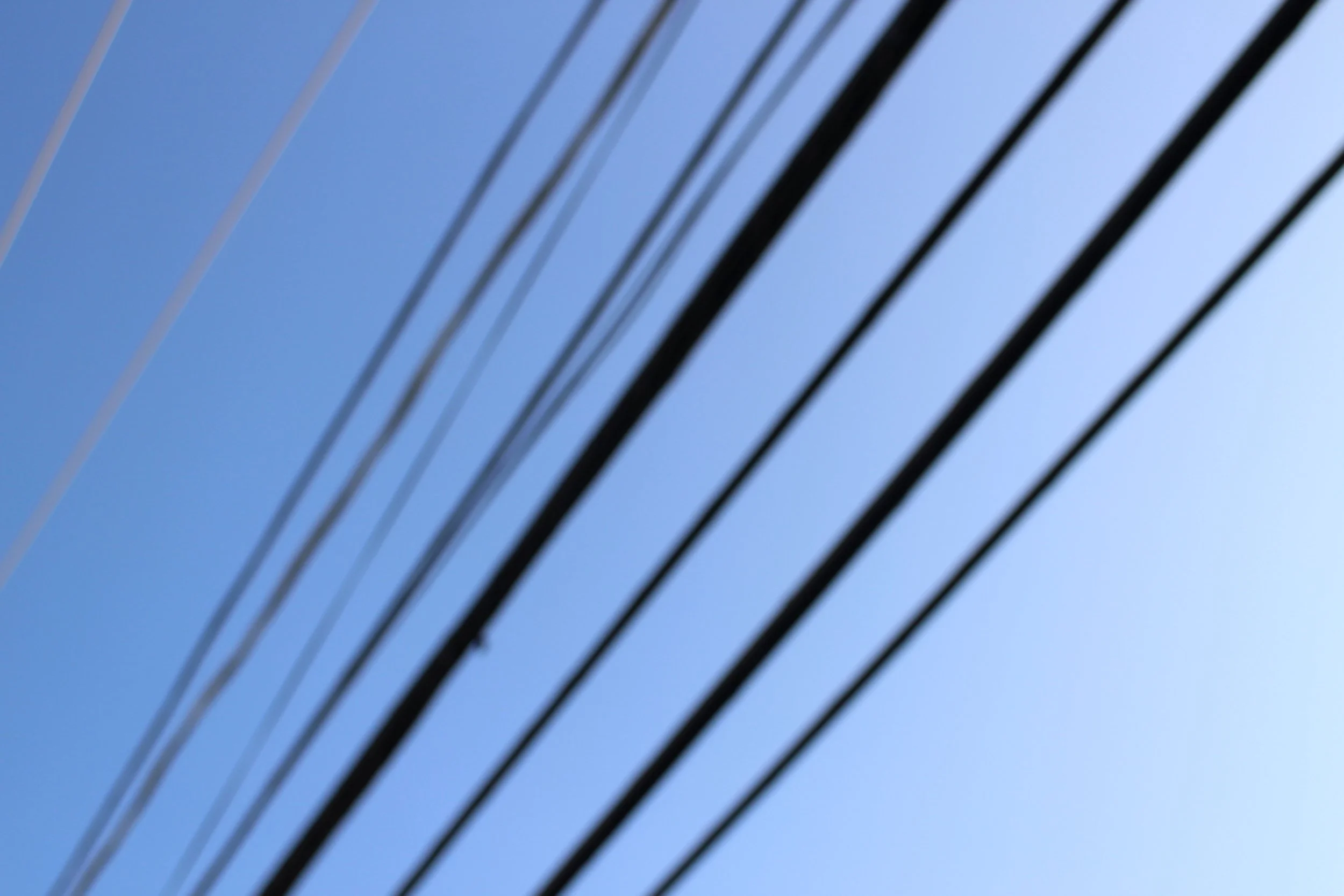 Pigeons perched on power lines against a cloudy sky, with a building in the background.