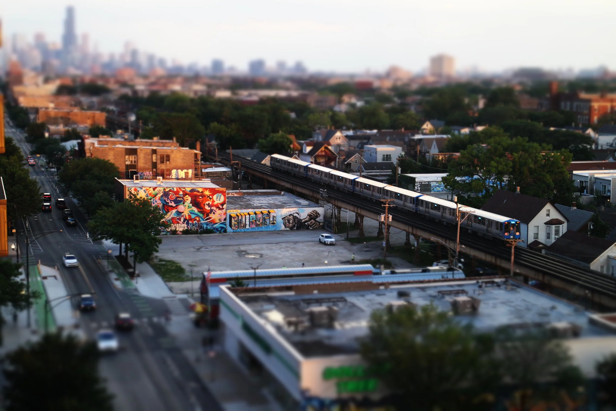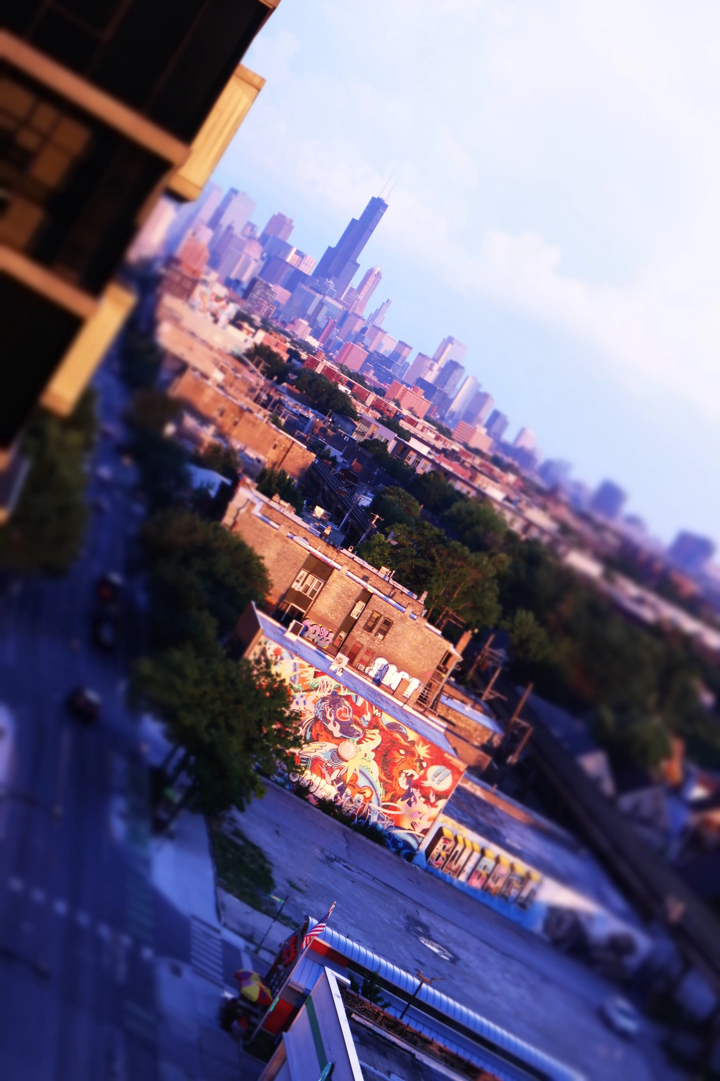 Upside-down urban neighborhood view with graffiti-adorned buildings and railway tracks. City skyline visible in the background.